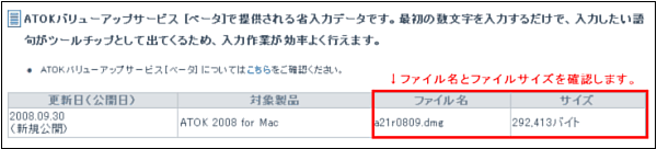 - ダウンロードしたファイルのファイル名と正しいファイルサイズをダウンロードページで確認します。