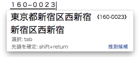郵便番号を3桁+ハイフンまで入力すると、住所が推測候補として表示され、入力するに従って該当する住所が絞り込まれます。